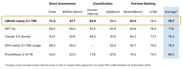• 💪 Robust performance: LMUnit is state-of-the-art on benchmarks that measure fine-grained details across multiple domains such as FLASK and BigGBench and on par with frontier models at coarse evaluation of Long-form Question Answering (LFQA). In addition, LMUnit outperformed GPT-4o and Claude 3.5 Sonnet by over 9% on scoring unit tests on Human-Internal, our in-house customer dataset containing finance and engineering domains.