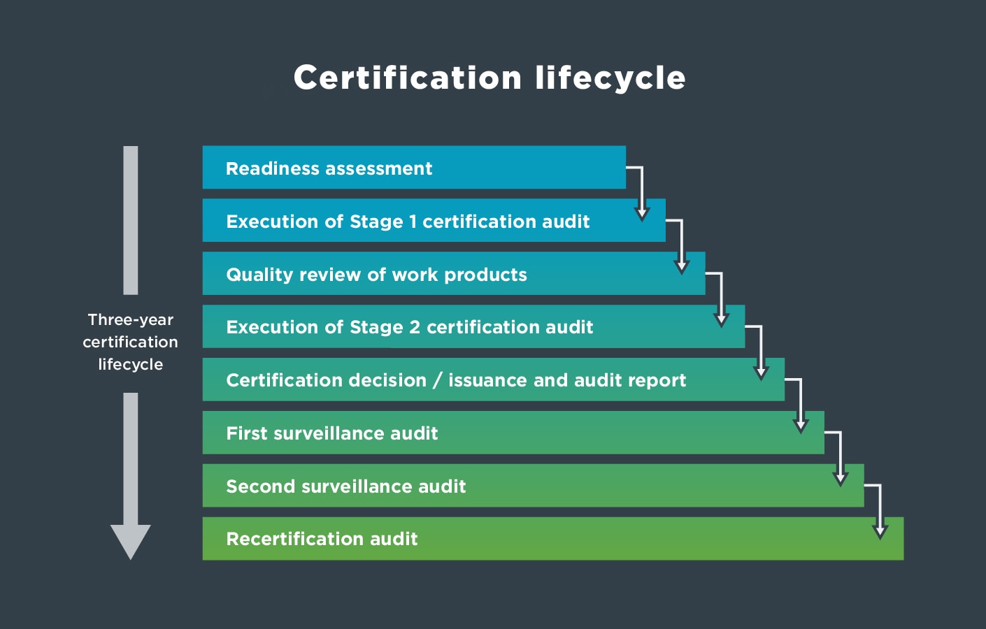 Certification is valid for three years. Annual surveillance audits are required during the second and third years following initial certification or recertification. During these audits, broad-stroke reviews are conducted to determine if any significant or relevant changes have been made to the management system. Limited testing is done to confirm that your organization is continuing to maintain the requirements of the underlying audit criteria between audit periods.