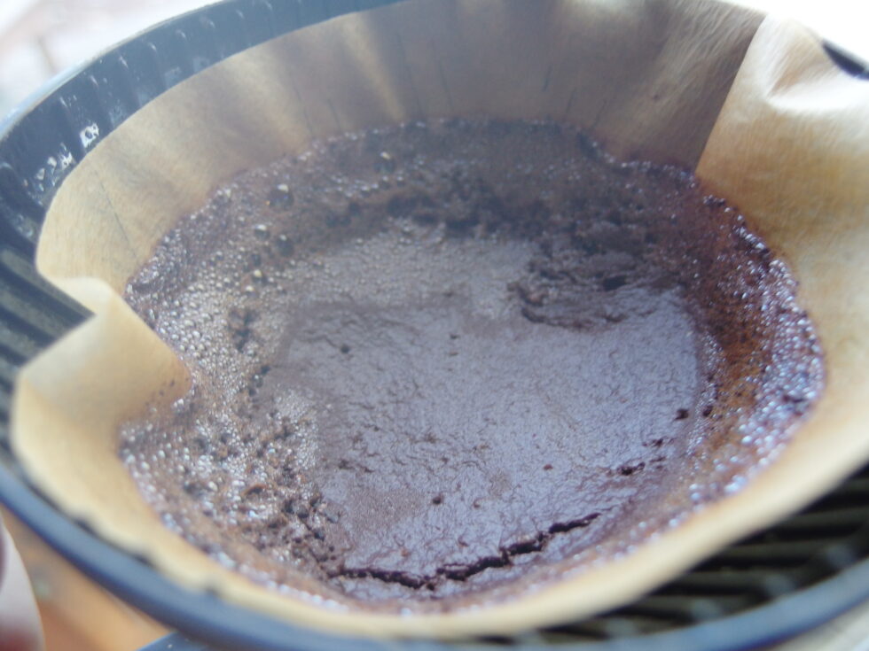 Water Soak Equality – Just look at the above photo! The SimplyGoodCoffee Olson brewer performed about as well as a manual pour-over, my highest praise for automatic drip. Look closely at the water droplets and realize the grounds are receiving nice full coverage. My month-long exclusive use of this machine shows it consistently did its job, spraying the hot water over the grounds, while the brewed coffee exit hole at the filter’s bottom is ideally sized to maintain a slightly elevated water level throughout the brewing cycle. You’ll note in the photo below how the grounds bed looked just after brewing. This “after” shot clearly shows how evenly the grounds have been soaked, a reliable indicator of evenly showered water over the grounds. The SimplyGoodCoffee Olson brewer goes beyond simply outperforming other automatic drip brewers; it matches the best manual pour-over devices that set the original standard!