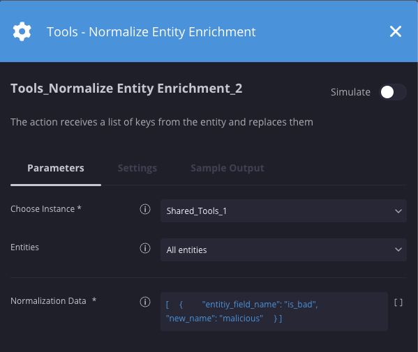 Normalization Data JSON N/A Yes Specify the JSON in the following format example: [ { "entity_field_name": "AT_fields_Name", "new_name": "InternalEnrichment_Name" }, { "entity_field_name": "AT_fields_Direct-Manager", "new_name": "InternalEnrichment_DirectManager_Name" }, { "entity_field_name": "AT_Manager_fields_Work-Email", "new_name": "InternalEnrichment_DirectManager_Email" } ]