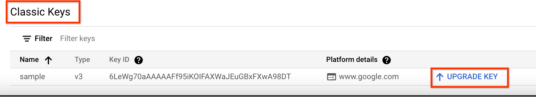 Aceda à página do reCAPTCHA e encontre a chave de site migrada na secção Chaves do reCAPTCHA.