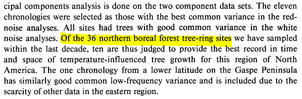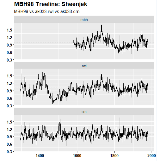 - an archive of measurement data for eight of the nine tree ring measurement data sets – inexplicably leaving out one data set (Yamal). Most of the datasets are familiar to Climate Audit readers from 2005-2012: two are from Graybill bristlecone sites (inclusive of updates by Salzer et al); three are based on (or identical to) measurement data from Briffa et al 2008 (which was under discussion when Climategate emails released). I presume that they used the Yamal dataset from Briffa (2013) and neglected to include it in the archive.