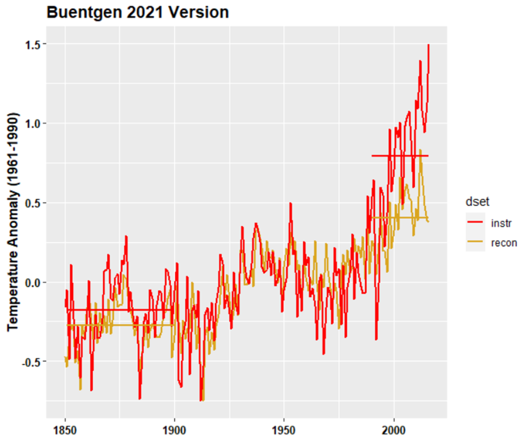 Below is a comparison of corresponding diagrams for Buentgen (2021) and Esper (2024). Buentgen (2021) appears to have a reference period of 1961-1990 and Esper (2024) a reference period of 1851-1900.