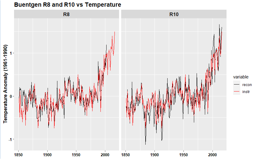 The next figure shows the R8 and R10 reconstructions against target instrumental temperature (reference 1961-1990). Both R8 and R10 show an astounding – almost perfect – reconstruction of the target instrumental temperature. The reconstructions are too perfect. Indeed, the astounding accuracy of these two reconstructions raises an obvious question: why didn’t Buentgen et al (2021) – and Esper et al (2024) – rely on these near-perfect reconstructions, rather than blending them into a mean with reconstructions (R2, R13, R14) that didn’t replicate modern instrumental temperature?