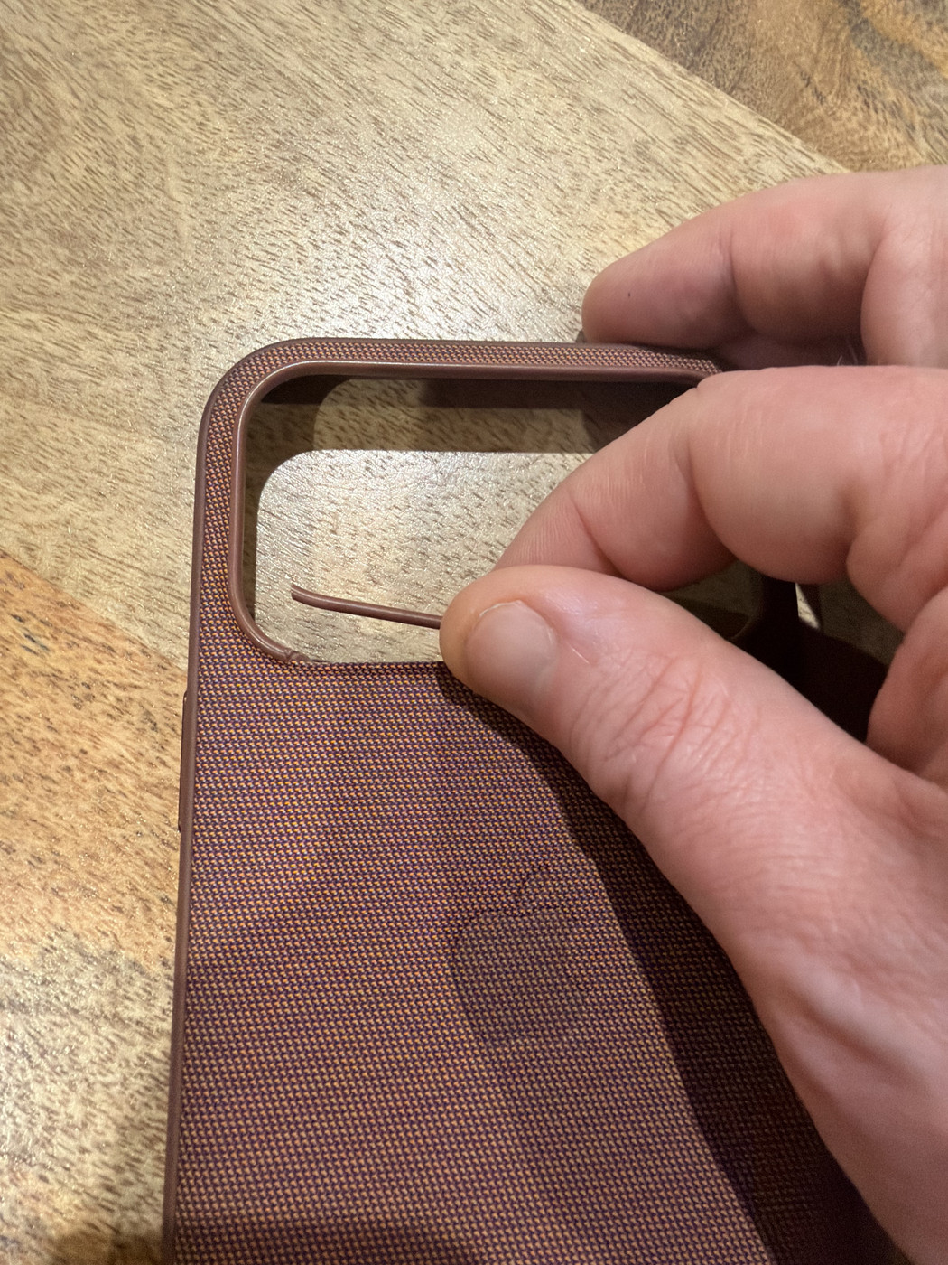 Due to no fault of my own it appears part of the frame around the camera bump on my Apple Techwoven case has decided to snap and separate from the case. Haven’t knocked it, bashed it. Just took it out of my pocket and felt it stab my finger.
