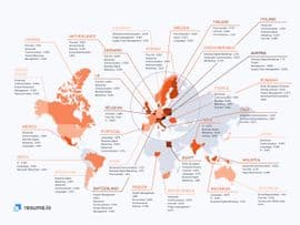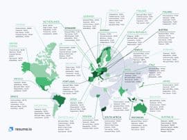 Nuestro análisis ha revelado varios patrones en las secciones de habilidades. En la mayoría de los países, menos del 50% de los currículums contienen las mismas habilidades. En otras palabras, los solicitantes han nombrado una mayor variedad de sus atributos. Sin embargo, tanto en Australia como en Estados Unidos, las 5 principales habilidades mencionadas fueron enumeradas por casi la mitad de los solicitantes de empleo. Eso significa que las secciones de habilidades en esos países se parecen bastante entre sí. También podrás notar que todos esos atributos son habilidades blandas.