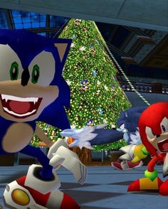sonic the hedgehog and mario kart racing in front of a christmas tree with lights