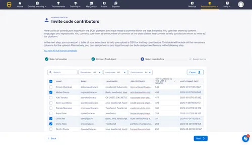 Identifizieren und integrieren Sie automatisch alle aktiven Code-Mitwirkenden in Ihrem Unternehmen. Durch die Überprüfung der Commit-Historie in Echtzeit deckt Trust Agent fehlende Lernende auf, identifiziert die Sprachen, in denen sie tatsächlich programmieren, und optimiert die Zuweisung von Teamaufgaben – so wird sichergestellt, dass kein Entwickler zurückbleibt und jeder Mitwirkende die richtige, sprachspezifische Schulung erhält.