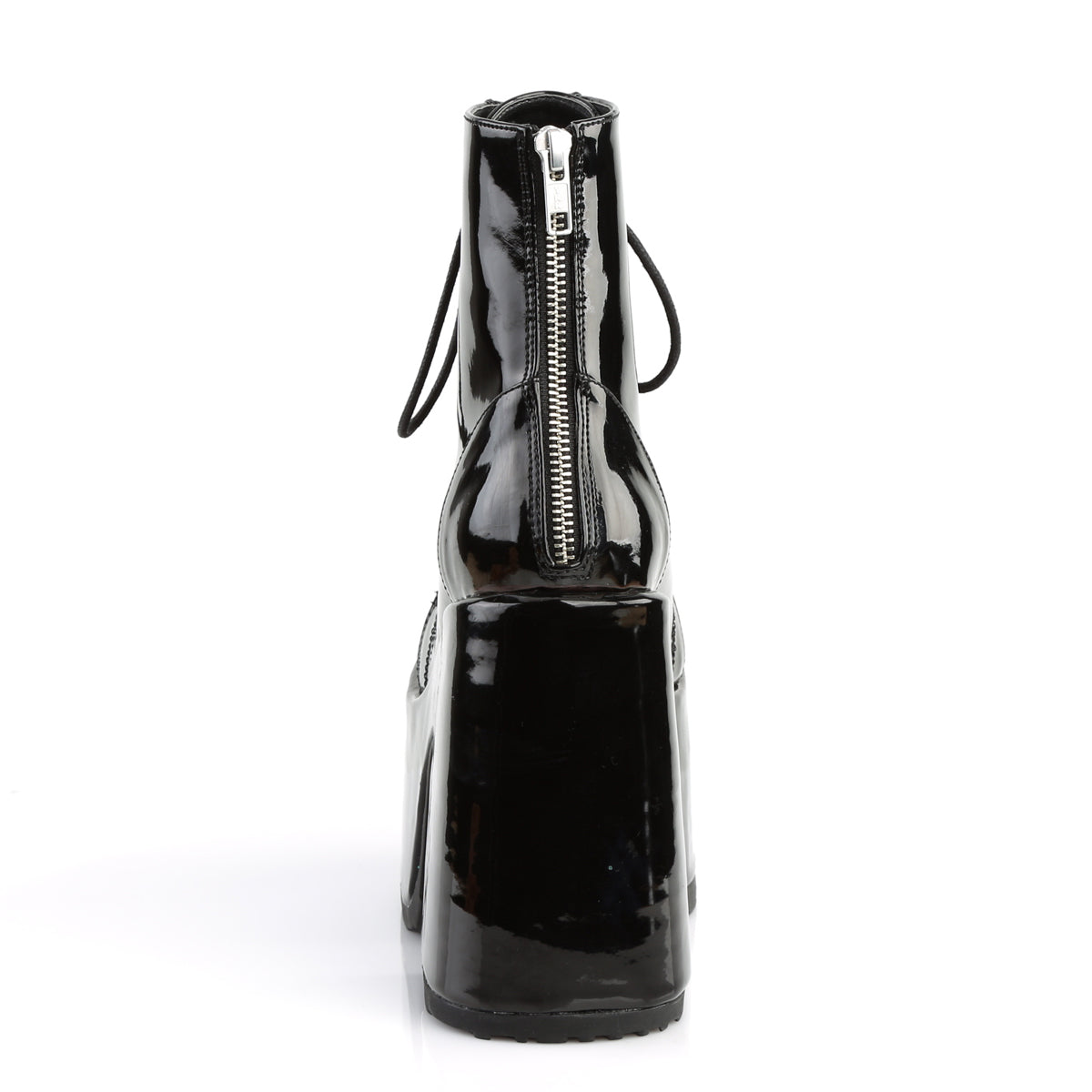 Step up your fashion game with the fierce and edgy Camel-203 ankle boots. These stunning boots feature a chunky 5" heel and a 3" platform, allowing you to stand out in any crowd. The sleek black patent leather provides a unique and captivating look, that is sure to turn heads wherever you go. Whether you're getting ready for a night out or want to make an effortless statement in your everyday ensemble, these boots are sure to elevate any outfit. The metal back zip closure ensures easy on and off, perfect for those who are always on the go. Add the Camel-203 to your shoedrobe today and step out in style.