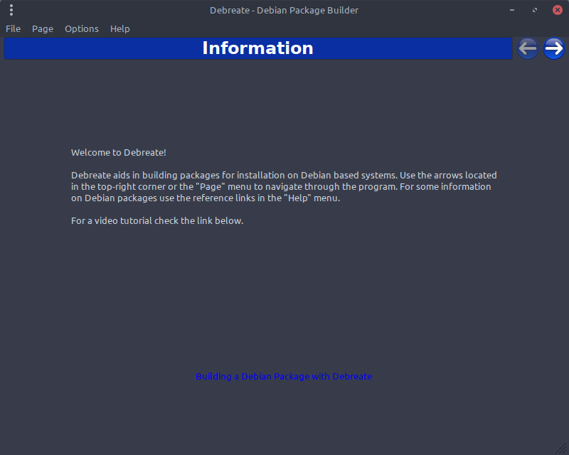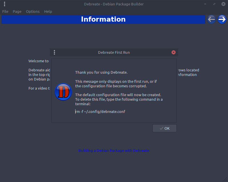 If the app's configuration file is not found on the system a dialog will display with a first time run message. A new configuration with default values will be created in ${HOME}/.config/debreate.conf. Close the dialog to access the main interface.
