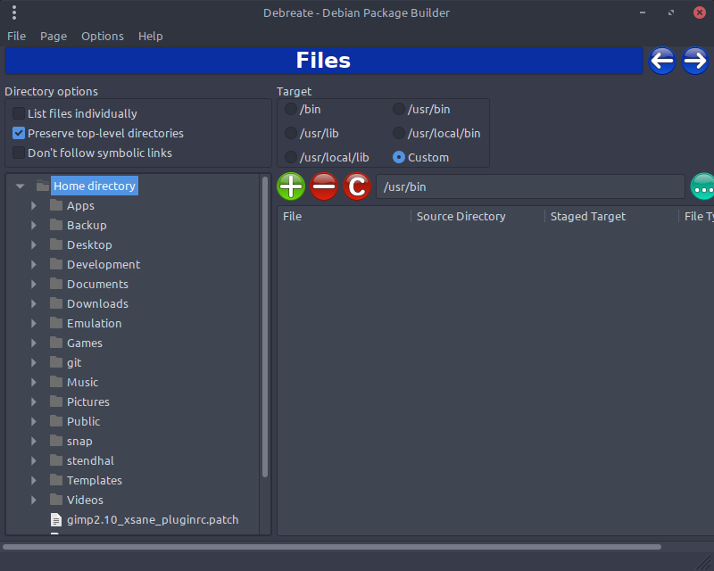 - Delete staged directory: Upon completion of package building, the directory tree constructed for temporary file placement will be deleted. It may be useful to disable this option for debugging build errors. (currently staged files are placed in the directory where the target package is built, but this will change to use the system's temporary directory in the future)