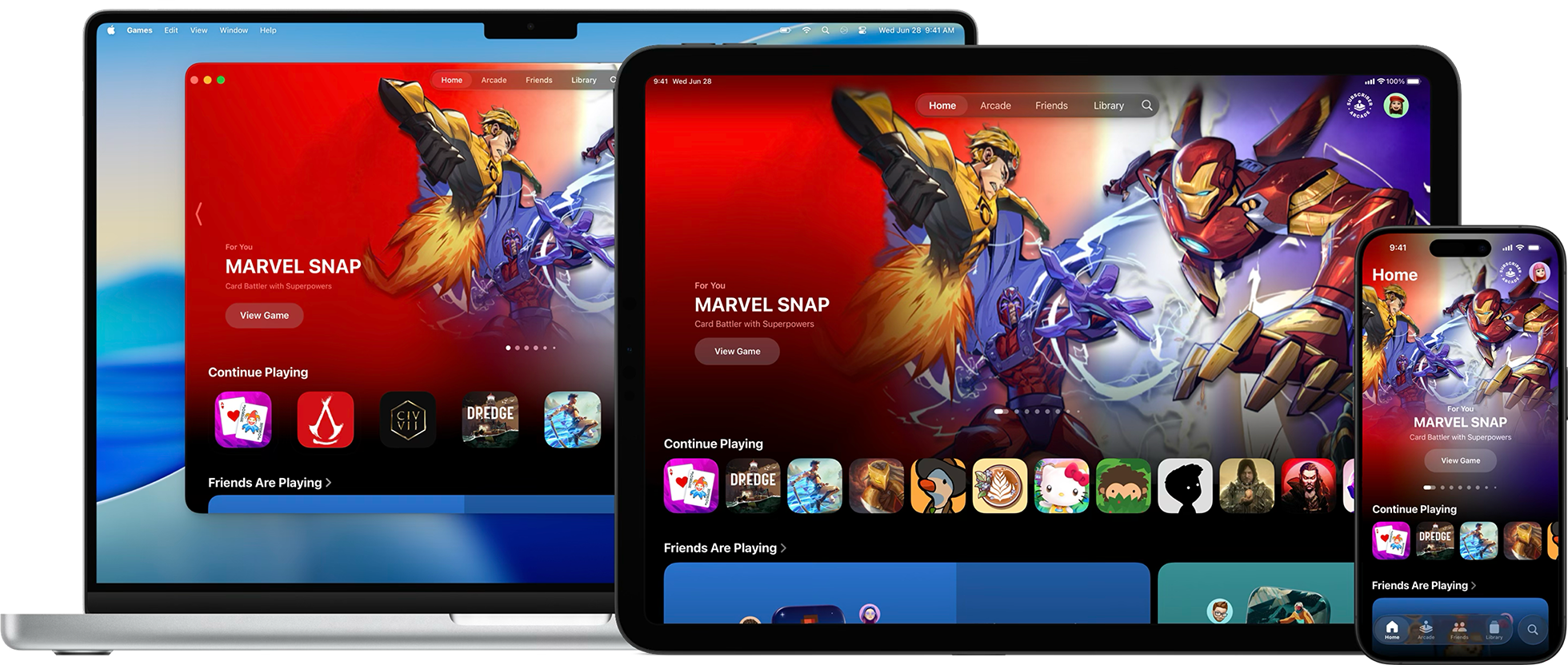 Apple Gamesアプリは、Appleデバイスでゲームをするのが好きなユーザーが集うための場所です。プレイヤーは、自分や友だちががプレイしているゲームに基づいてパーソナライズされたおすすめから新しいゲームを見つけることができます。デベロッパにとって、まったく新しい方法でゲームを見つけてもらえる場となります。Apple Gamesアプリは、iOS 26、iPadOS 26、macOS 26以降を搭載したデバイスにプリインストールされています。