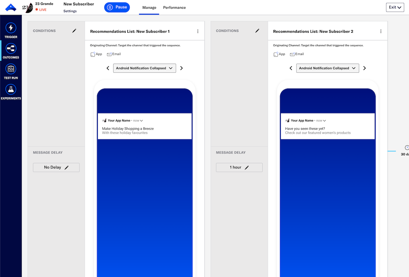 Retail — When a user becomes high risk for churn, send messages with increasing discounts to email, SMS, web, and app channels, to entice them back to your app or website. Channel Coordination strategy: Fan OutA Channel Coordination strategy that targets a Named User on all the channels they are opted in to, maximizing the chances they receive your message..