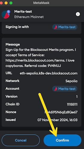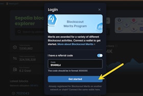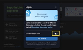 If you already have a Blockscout account, you can still use a referral code to sign up for the Merits program. Login to your Blockscout account and paste in the referral link or press the Merits button to start. Follow the process above starting with step 5.