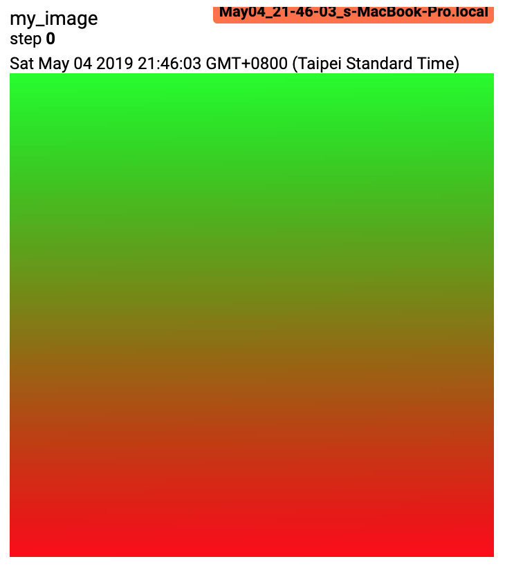 from torch.utils.tensorboard import SummaryWriter import numpy as np img_batch = np.zeros((16, 3, 100, 100)) for i in range(16): img_batch[i, 0] = np.arange(0, 10000).reshape(100, 100) / 10000 / 16 * i img_batch[i, 1] = (1 - np.arange(0, 10000).reshape(100, 100) / 10000) / 16 * i writer = SummaryWriter() writer.add_images('my_image_batch', img_batch, 0) writer.close()