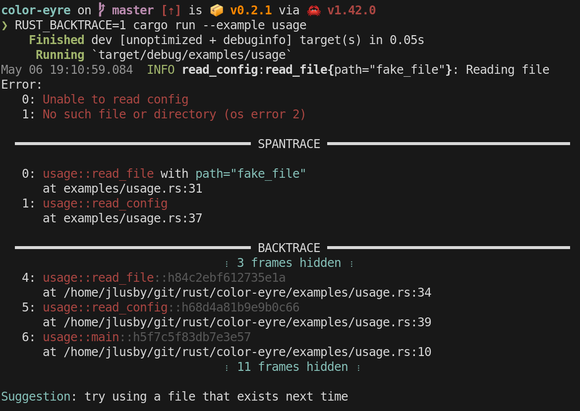 An error report handler for panics and eyre::Reports for colorful, consistent, and well formatted error reports for all kinds of errors.