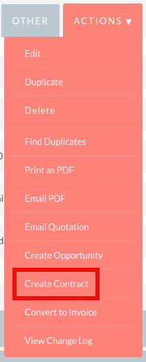As well as converting to an Invoice, AOS allows users to create a Contract based on a Quote. This can be done by clicking the 'Create Contract' button on the Quote Detail View.