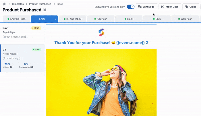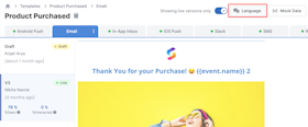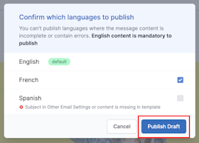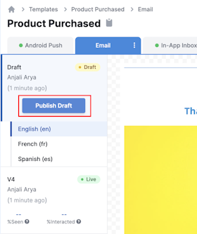 Once the required languages are added, you’ll see the enabled languages in the side panel - draft version. The languages are set at template group level, that is it will be enabled for all the channels at once. However, you can choose which language content to publish at the time of publishing the draft.Add the content for each of these languages.