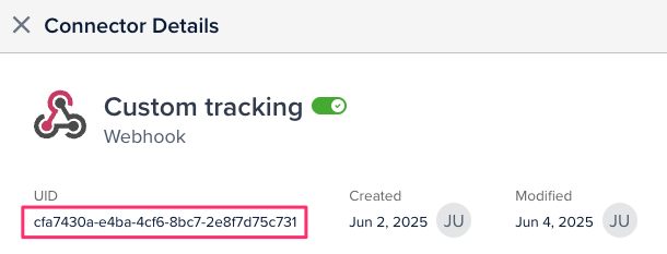 The Connector Details screen is displayed, which shows the UID for the connector below the connector name. For example:
