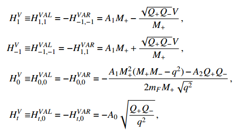 -dependencies of the differential branching fractions, forward-backward asymmetries, and longitudinal polarizations of final vector mesons have not yet been completely measured to date. In Fig. 5, we consider the decays