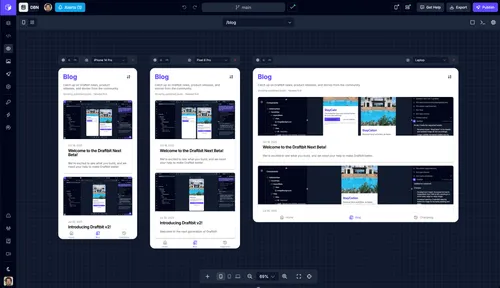 Draftbit offers a powerful app preview mode that lets you see and interact with all the screens in your app at the same time on an infinite preview canvas. Pan and zoom to get a better view, choose between web (laptop/desktop) and native (iOS/Android) devices, change the device orientation (landscape/portrait), and switch device sizes.