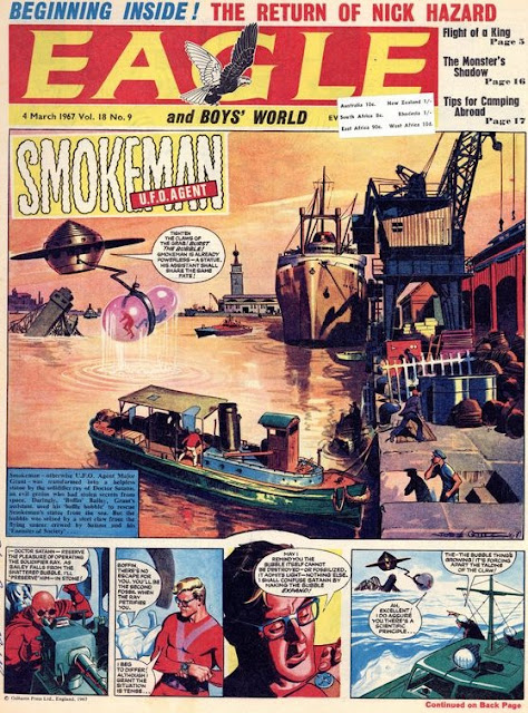 Fourteen weeks after the emergence of Smokeman, the strip was moved to EAGLE's front and back cover, with the issue dated February 25th 1967 and retitled Smokeman the U.F.O. Agent. It was only the second fictional series to be accorded front page status. Doctor Satann's plans to undermine the world order were finally thwarted in the issue dated April 8th 1967, with the Doctor escaping from our heroes in a stolen Zetan U.F.O. Although the door was left open for his return in a future adventure, he never appeared again and the strip reverted to mysterious ghostly stories.