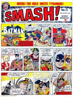 This change was undoubtedly prompted by the success of the American television series Batman, which was shown in Britain from May 1966. Based on the long established DC Comics character, Batman did not actually possess super powers, although thanks to his array of impressive gadgets, his 'Batmobile' car and his costume and mask, he was certainly regarded as a super hero. Additionally in America, another comic publisher, Marvel, had boosted the popularity of comics and emerged as a rival to D.C. with a family of new super heroes created by Stan Lee. Anticipating the success of Batman on television prompted Alfred Wallace, the managing editor of Odhams juvenile publications, to negotiate with DC Comics to publish reprints of his syndicated newspaper adventures under licence in his recently launched Smash! comic. Wallace also negotiated with Marvel to reprint The Hulk's adventures in Smash! and this strip began in Issue 16, dated 26th May 1966, with Batman beginning in Issue 20, dated 18th June.