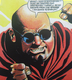 Doctor Satann, the evil mastermind behind the Enemies of Society, was in many ways a pantomime villain. Bald and obese, he wore a tight red costume with a red cloak, like the clothing that his biblical namesake is often depicted wearing. He was clearly inspired by the comical villains in the self-mocking Batman television series. Some of these characters originated in the Batman comics, which were aimed at a less sophisticated readership than EAGLE, but all were made more ludicrous on television. However, Smokeman was not a parody and the Doctor needed to be powerful and dangerous to be a worthy opponent for the U.F.O. agents. Fortunately Ortiz rose to the challenge and in several impressive close-ups he depicts the character's gloating malevolence and gives him the required menace to prevent him from being ridiculous. The Doctor's power came from the fact that he had stolen Zetan technology, making himself their equal. Armed with this technology he tracks Grant and Bailey to their island base and inadvertantly creates Smokeman when he tries to kill Grant and his Zetan ally. The continuing story then takes the action all over the world as Grant and Bailey fight a running battle with the Doctor and his minions. Grant requires great concentration to change to Smokeman and sometimes struggles to do so, providing perilous situations for himself. Doctor Satann also develops weapons which manage to trap and neutralise him, but fortunately Grant and Bailey always outwit him, until eventually they chase him to his own lair and destroy it.