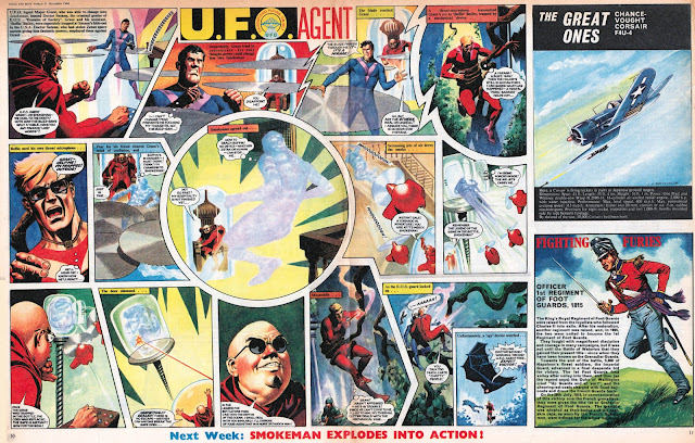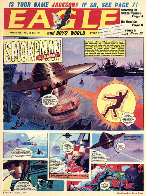 While American super hero reprints were not suitable for EAGLE, Wallace clearly believed that a home grown super hero strip could succeed. The reason why U.F.O. Agent was developed into that strip seems fairly obvious. It already featured contemporary crime fighting heroes who travelled the world in extra-terrestrial craft, so Major Grant's change to Smokeman did not vastly alter the nature of the strip. Also, U.F.O. Agent was quite successful, without being long established and so the change could be helped by the audience's familiarity with the characters and situation, without being hindered by any deeply rooted preconceptions that long running characters engender.