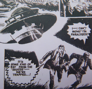 The first episode of U.F.O. Agent was no let- down however. It introduced the two heroes and their alien allies and set the scene for the series that followed. The story begins with Grant and Bailey racing in Grant's sports car towards an old mysterious house in answer to an intriguing call from a professor Galbraith, who said that it was vital to the world's security that they meet him. Arriving at the dilapidated house, Grant and Bailey find a clue, which readers are invited to spot. Observant readers could see that the clue is strange circular indentations in the grass beside the house. The circles are quickly revealed to be the supporting legs of a flying saucer, as one now flies into view and catches our heroes in a paralysing beam as the try to run for cover. Happily, the saucer contains benevolent aliens who watch over Earth from 'Satellite Zeta'. These aliens land and declare that they have chosen Grant and Bailey to be their agents on Earth to combat the forces of evil. The Zetans are humanoid in shape, but slightly smaller in height. Their heads, concealed by space helmets with dark visors, are apparently oval shaped and larger than human heads. They seem to require spacesuits on Earth, for they are never seen without them.