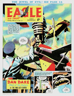It is now seventy five years since EAGLE was launched, on April 14th 1950. A huge success for its first decade, it ran until 1969, when it was absorbed by its rival paper Lion. Created by the Rev. Marcus Morris, a Southport Vicar, its early success was primarily due to the work of artist Frank Hampson and his creation 'Dan Dare Pilot of the Future'. The popularity of Dan Dare cannot be overstated. The strip made science fiction acceptable and respectable at a time when many older people dismissed it as ridiculous and EAGLE was read by a lot of older people as well as its principal audience of 7 - 16 year olds. It also promoted interest in outer space and the possibility and credibility of space travel. Stephen Hawking cited 'Dan Dare' as the reason he became a Cosmologist. EAGLE also made comics acceptable to many adults, although it would never admit to being a comic! The fact that the editor was a Vicar and that EAGLE promoted a 'muscular Christianity' in its pages brought parents and teachers onside. The early issues of EAGLE also included the popular radio character 'PC 49', written by Alan Stranks. Initially drawn by Strom Gould it was illustrated for most of its seven year run by John Worsley. There were three other strips by Hampson in the first issue: 'Rob Conway', 'Tommy Walls', an advertising strip for Walls Ice Cream and the life of St. Paul, but he quickly passed these on to other hands to enable him to focus on the runaway success of 'Dan Dare'. 'Captain Pugwash' by John Ryan also made his first ever appearance in the first EAGLE. The centre pages featured 'cutaway drawings' of aircraft, cars, ships and other technological marvels. The most prolific 'cutaway' artist was Leslie Ashwell Wood. The 'cutaways' would run for the entire life of EAGLE and Ashwell Wood illustrated the first and the last. The early issues also included an informative science strip called 'Professor Brittain Explains' and a regular sports page, which featured contributions from well known sportsmen. Over the next few years, other popular strips joined 'Dan Dare'. 'Riders of the Range' was by Charles Chilton and was based on his radio series about cowboys in the American west, This strip began in the Christmas issue in 1950 and was originally illustrated by Jack Daniel and then by Angus Scott, before Frank Humphris took over in 1952. The strip ran until 1962. 'Luck of the Legion' (1952 - 61) was written by Geoffrey Bond and illustrated by Martin Aitchison, 'Jack O' Lantern' (1955 - 59) told the adventures of a boy in the early nineteenth century and was written by George Beardmore, with illustrations by Robert Ayton. 'Storm Nelson - Sea Adventurer' (1953 - 1962) was written by Guy Morgan and drawn by Richard Jennings and 'Harris Tweed Extra Special Agent' (1950 - 62) by John Ryan, replaced his 'Captain Pugwash' who went on to greater success in books and on television. Another comedy strip was the three frame weekly 'short' 'Chicko' (1950 - 62) by Norman Thelwell. The famous Belgian cartoon hero Tintin also made his first ever appearance in English in EAGLE (1951 - 52). The back featured biographies of saints and famous Britons, including Saint Patrick, Saint Louis of France, Alfred the Great, Lord Nelson, David Livingstone and Baden Powell, illustrated by Norman Williams. Many of these biographies were written by the Rev. Chad Varah, who founded the Samaritans. Later, Frank Bellamy illustrated the life of Winston Churchill and King David for the back page, before taking over the 'Dan Dare' strip for a year and subsequently drawing 'Fraser of Africa' (1960 - 61), the life of Field Marshal Montgomery (1962) and finally the celebrated 'Heros the Spartan' strip in the early 1960s. In 1960 - 61, Frank Hampson illustrated the story of Christ for the back page. Sadly, this was his last major work for EAGLE.