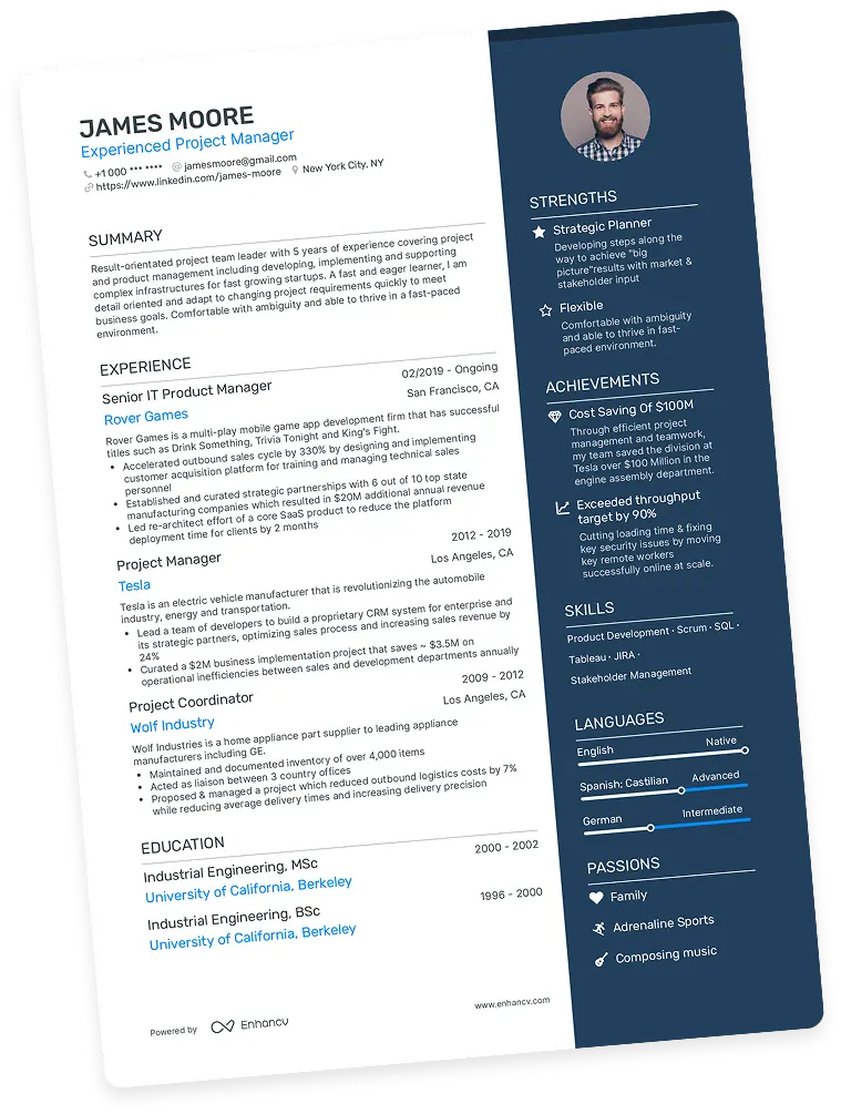 - Senior professionals & executives – Enhancv focuses on leadership, impact, and results. It keeps things concise and impressive in a one- or two-page layout, ideal for people who value their time and reputation.
