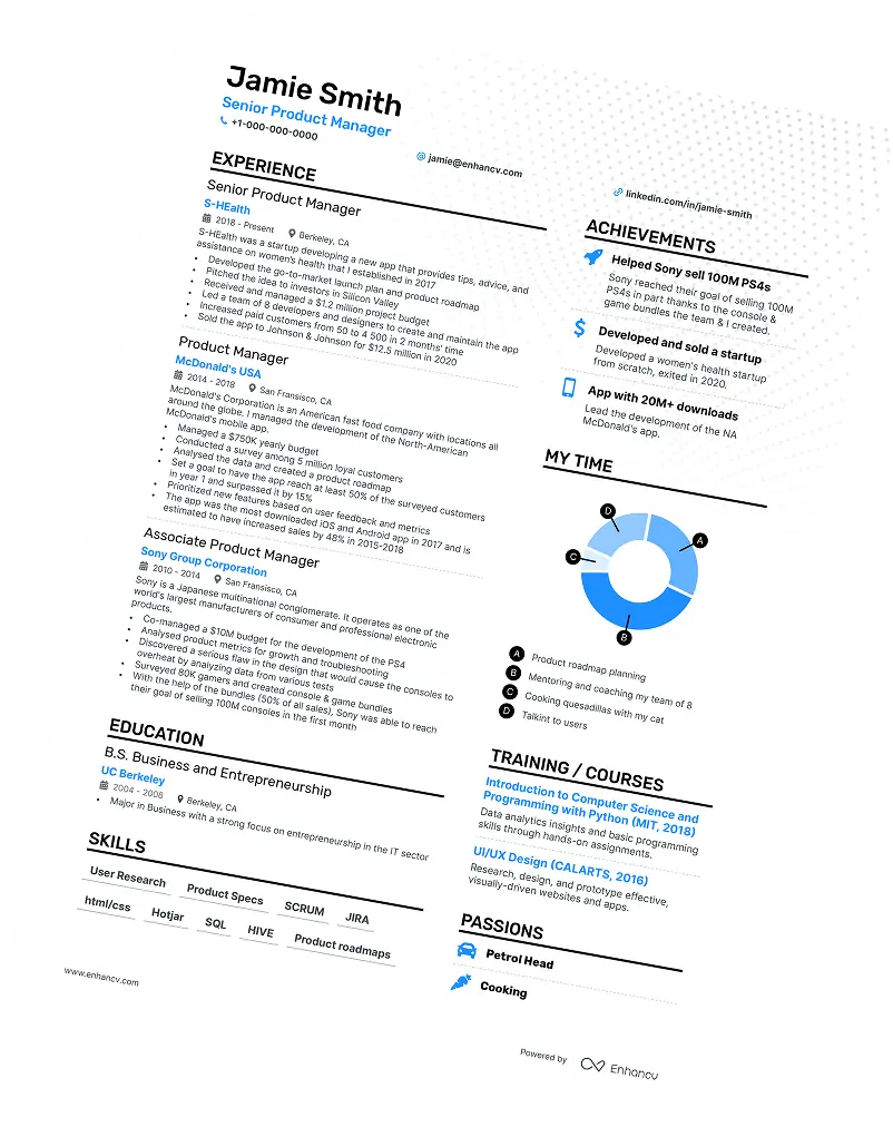 - Proven results: Enhancv users have landed jobs at companies like Spotify, JP Morgan, and Microsoft - real-world proof that the format works.