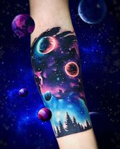 a wolf standing on top of a forest under a night sky with stars and the moon