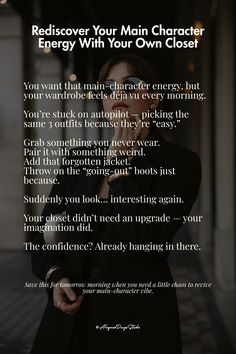 A fun call-to-action encouraging people to experiment with their wardrobe and find unexpected outfit combinations. main character energy, outfit inspo, style tips, closet shopping, confidence boost, creative outfits Tomorrow morning, grab something you never wear. Pair it with something weird. Add a jacket you forgot you owned. Throw on the “going out” boots even if you’re not going anywhere. Make a mess, try things on, and rediscover your main character energy. Your closet is probably...