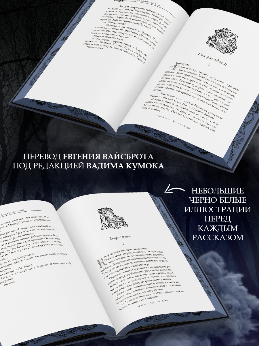 Книгой «Последнее желание» начинается один из лучших циклов в истории жанра фэнтези. Семь новелл о ведьмаке Геральте из Ривии, его друзьях и возлюбленных, о его нелегкой «работе» по истреблению всякой нечисти, о мире, населенном эльфами, гномами, оборотнями, драконами, и, конечно, людьми — со всеми их страстями, пороками и добродетелями. Сага А. Сапковского давно занимает почетное место в мировой традиции жанра фэнтези, а Геральт стал культовым персонажем не только в мире литературы, но в универсуме компьютерных игр. Аудитория пана Анджея неуклонно расширяется, и мы рады содействовать этому, выпустив первую книгу о Ведьмаке с иллюстрациями, созданными специально для этого издания.