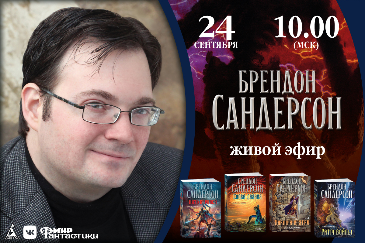 Под выход книги был обещан более подробный анонс в издательской колонке. Однако у нас есть кое-что получше вместо текста с картинками и фотографиями. 24 сентября, в 10:00 по московскому времени, издательство "Азбука" и "Мир фантастики" совместно проводят стрим (интервью в прямом эфире) с Брендоном Сандерсоном. Эфир будет транслироваться в сообществе "Мир фантастики" во ВК. Для тех, кто не сможет подключиться в прямом эфире, стрим будет доступен в записи.