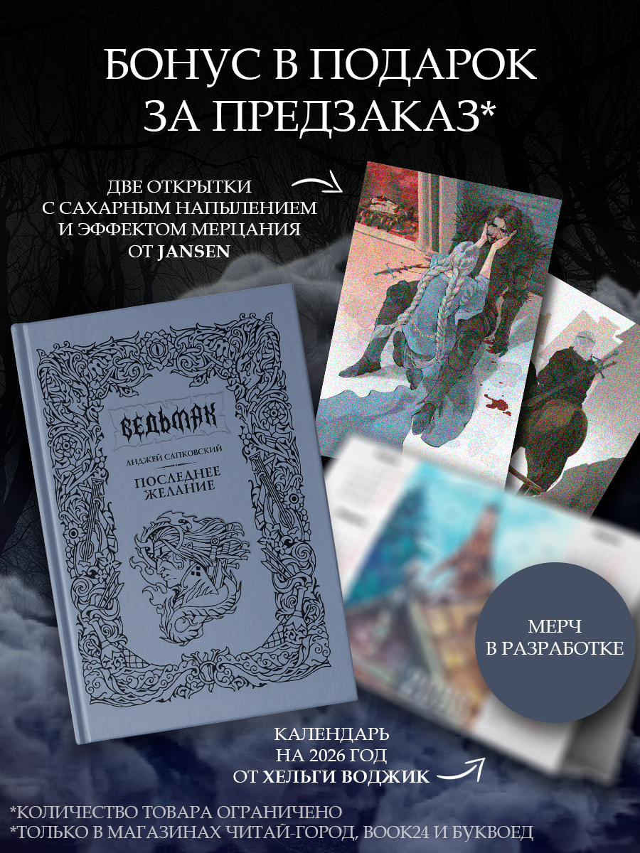 «Она пришла под утро. Вошла осторожно, тихо, бесшумно ступая, плывя по комнате, словно призрак, привидение, а единственным звуком, выдававшим ее движение, был шорох накидки, прикасавшейся к голому телу.».... Нет, мы не собираемся публиковать тут начало «Последнего желания»Анджея Сапковского! Мы предлагаем вам перечитать его в новом подарочном издании!