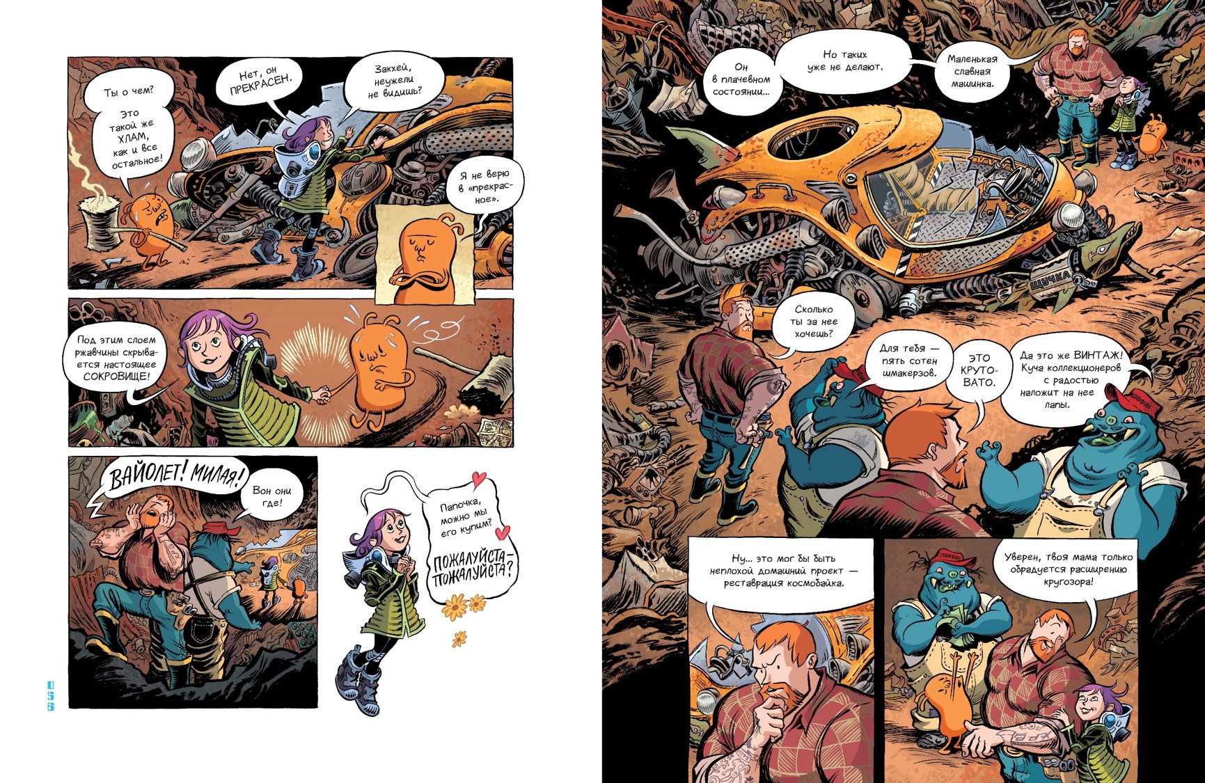 Аннотация: Вайолет живет с папой-пилотом и мамой-дизайнером в одном из космических трейлер-парков. Однажды во время опасного вылета отец Вайолет пропадает и бесстрашная девочка решает отправиться на его поиски. На пути ей встречаются инопланетные помощники: Закхей, похожий на фасолину, и Элиот Марсель Опгенорт, заучка-цыпленок. Вместе они пускаются в полное неожиданных поворотов приключение, ссорятся и мирятся, радуются и плачут, шутят и спасают Вселенную. Захватывающий и невероятно умилительный комикс, в увлекательной форме рассказывающий историю о самом важном — семье, дружбе, смелости и верности.