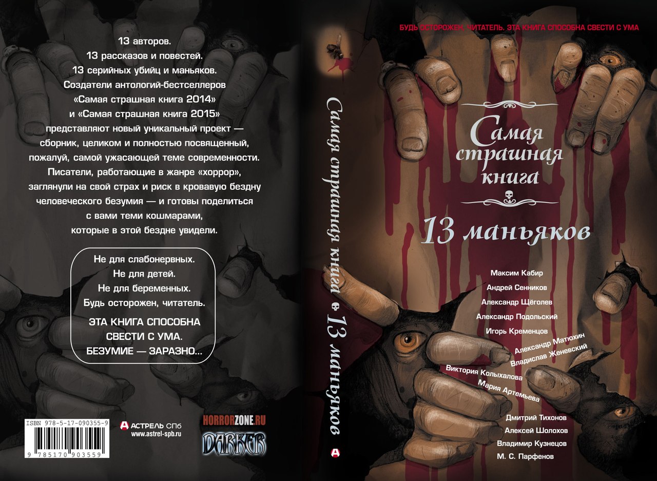 Аннотация: 13 авторов. 13 рассказов и повестей. 13 серийных убийц и маньяков. Создатели антологий-бестселлеров «Пазл» и «Самая страшная книга» представляют новый уникальный проект — сборник, целиком и полностью посвященный, пожалуй, самой ужасающей теме современности. Писатели, работающие в жанре «хоррор», заглянули на свой страх и риск в кровавую бездну человеческого безумия — и готовы поделиться с вами теми кошмарами, которые в этой бездне увидели. Не для слабонервных. Не для детей. Не для беременных. Будь осторожен, читатель. Эта книга способна свести с ума. Безумие — заразно...