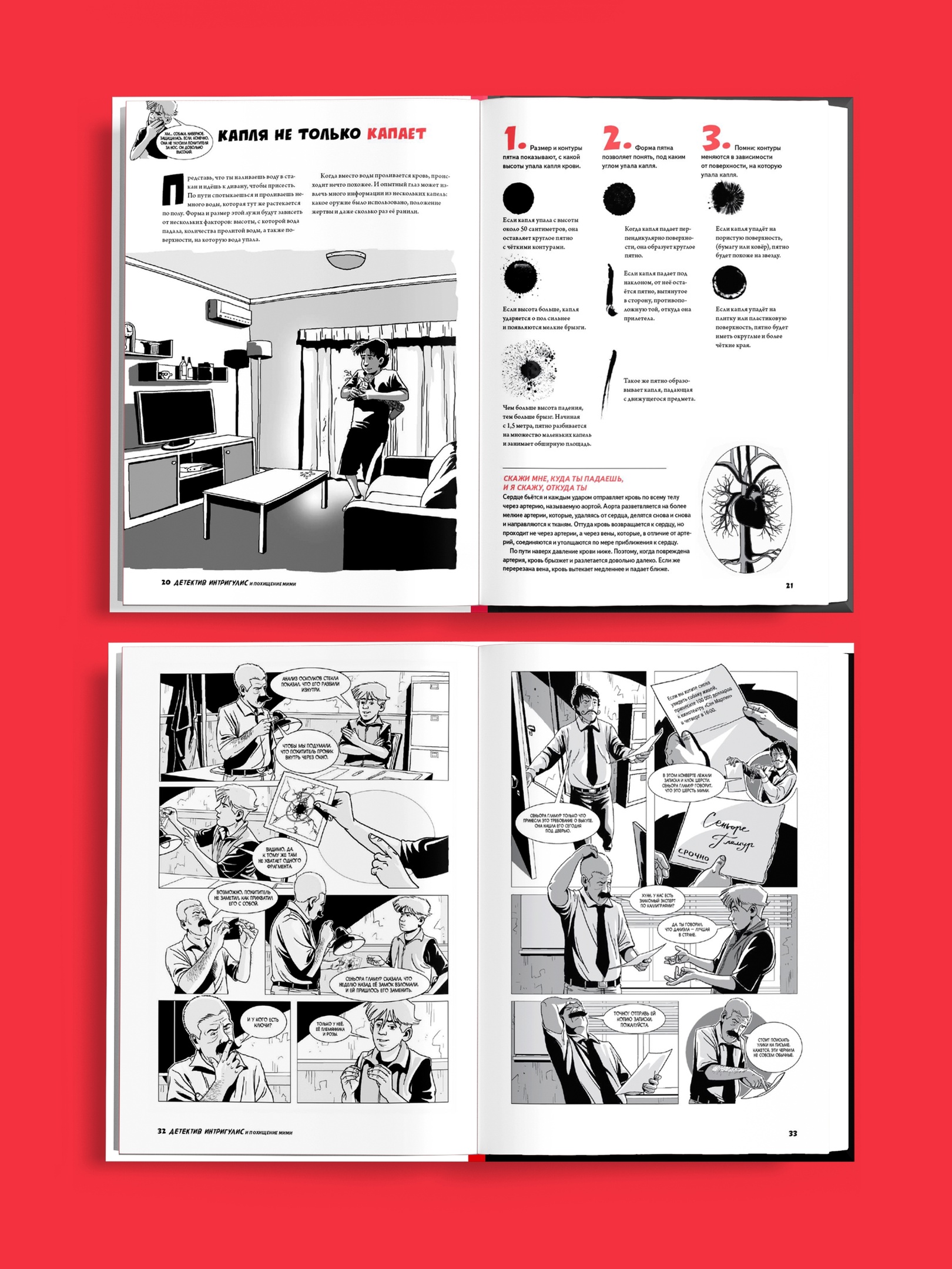 Очень необычный формат: информация в доступной форме комиксов, ребёнок легко поймет сюжет и основные идеи. А научпоп вставки подробно описывают методы работы детективов и судмедэкспертов.