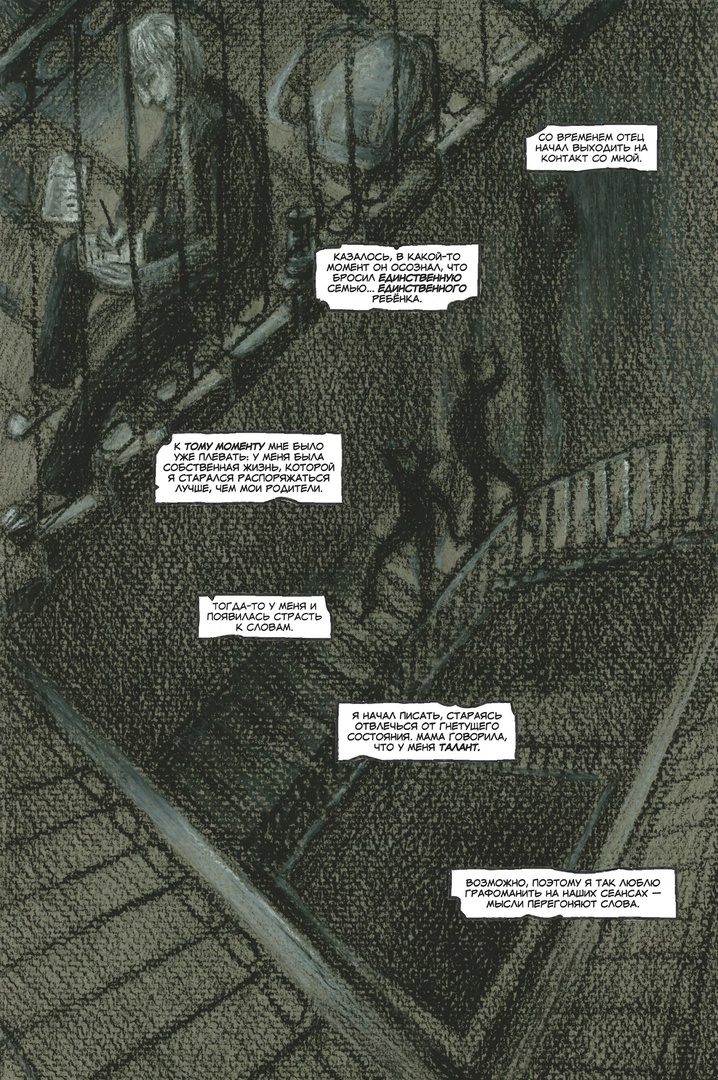 Лемир уже несколько раз работал вместе с художником Соррентино – над сериями «Зелёная Стрела» и «Старик Логан» и комиксом «Гидеон Фолз». В частности, в «Гидеон Фолз», хоррор-комиксе о психических расстройствах, иллюстрации рассказывают много больше, чем текстовые бабблы. Соррентино – весьма неординарный художник, и его визуальный стиль за внешней фотографичностью скрывает многослойное повествование. Слой за слоем, как разматывающиеся бинты, присохшие к ране, он снимает налёт нормальности с обычных видовых сценок, превращая минимальными средствами в пугающее зазеркалье то, что для человека рационального выглядит как газетные фото или стоп-кадры фильма. Таким работам нужен особый формат.