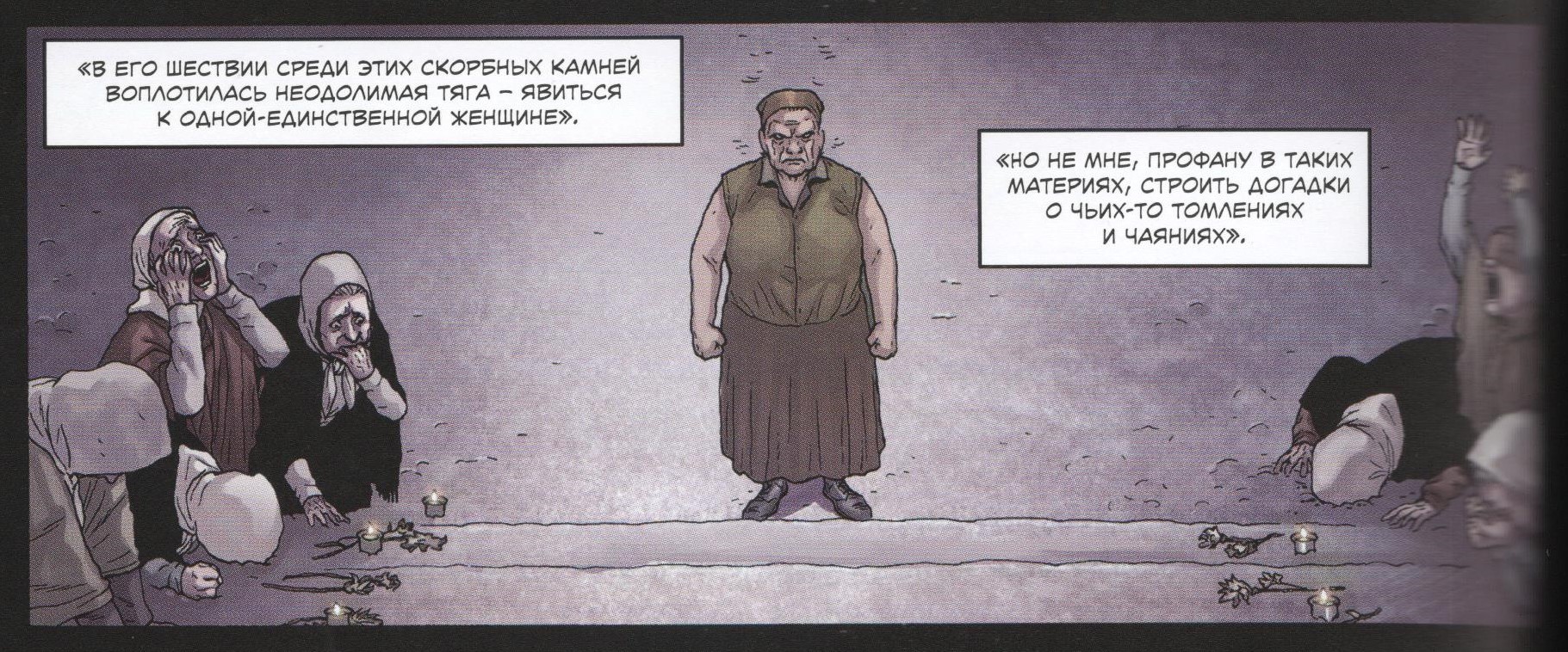 Однако там же есть еще 11 и 12 главы, и вот они требуют третьего уровня чтения – знания комиксов Алана Мура "Двор" и "Неономикон", по отношению к которым "Провиденс" выступает приквелом, спин-оффом и la grande finale одновременно.