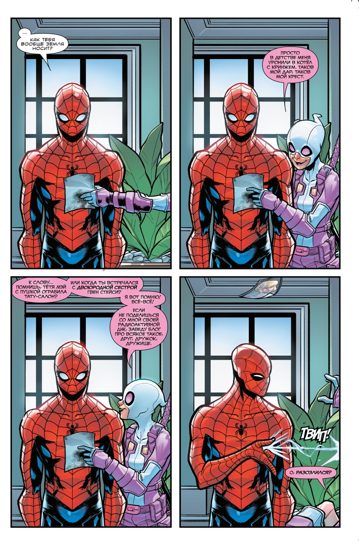 Что делает Гвен, когда попадает в какую-нибудь вселенную? Правильно, наводит там шорох! Именно такая участь настигла Вселенную Marvel, и как итог — нашей героине в розовом угрожает забвение. Поэтому ей нужно срочно наследить на 616-й Земле так, чтобы её точно все запомнили! В программе: раскрытие тайны личности Человека-паука, нападение на жилище Фантастической Четвёрки, сражение с Бессмертным Халком и жонглирование Мьёльниром Тора. Пристегните ремни и приготовьтесь: вас ждёт лучший в истории сиквел, в подзаголовке которого есть фраза «Наносит ответный удар»!