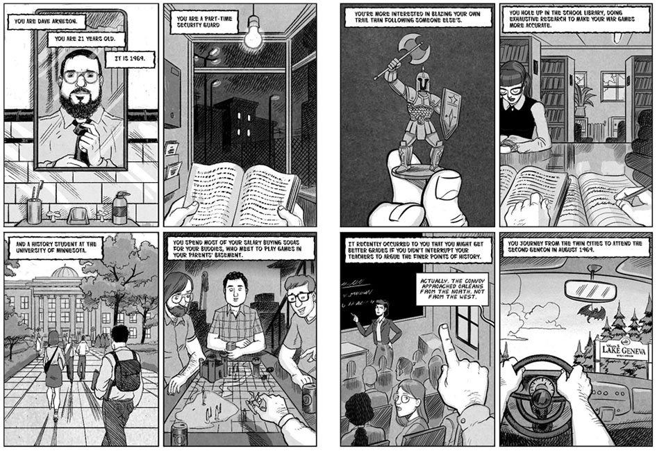 Итак, в истории игры D&D авторы фокусируются в первую очередь на ее создателях Гэри Гайгэксе и Дэйве Арнесоне. Главы написаны и нарисованы остроумным образом от первого-второго лица, как будто читатель это игрок, а автор — Мастер. И Мастер предлагает читателю примерить на себя роли самих отцов-основателей «Dungeons & Dragons», начиная с их детских лет.