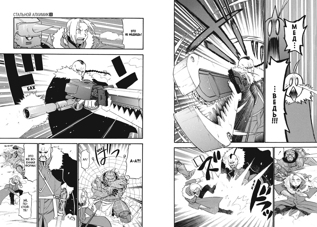 цитатаОтряд алхимиков завершает зачистку Ишвара, Рой Мустанг вынашивает большие планы, а братья Элрики продолжают поиски Мэй и Шрама. Они могут помочь понять братьям, что случилось с их способностями к алхимии после пребывания в подземелье за Вратами. В это же время Шрам разыскивает дневники своего брата, изучавшего алхимию. В этих дневниках может содержаться секрет бессмертия. Поиски «маленькой кошатницы» приведут братьев в крепость, где командир – сестра майора Армстронга, генерал-майор Оливия Мира Армстронг! Ещё более удивительное открытие о замыслах гомункулов вот-вот прорвётся наружу из подземелий крепости…В том вошли главы 61–66 и галерея набросков.