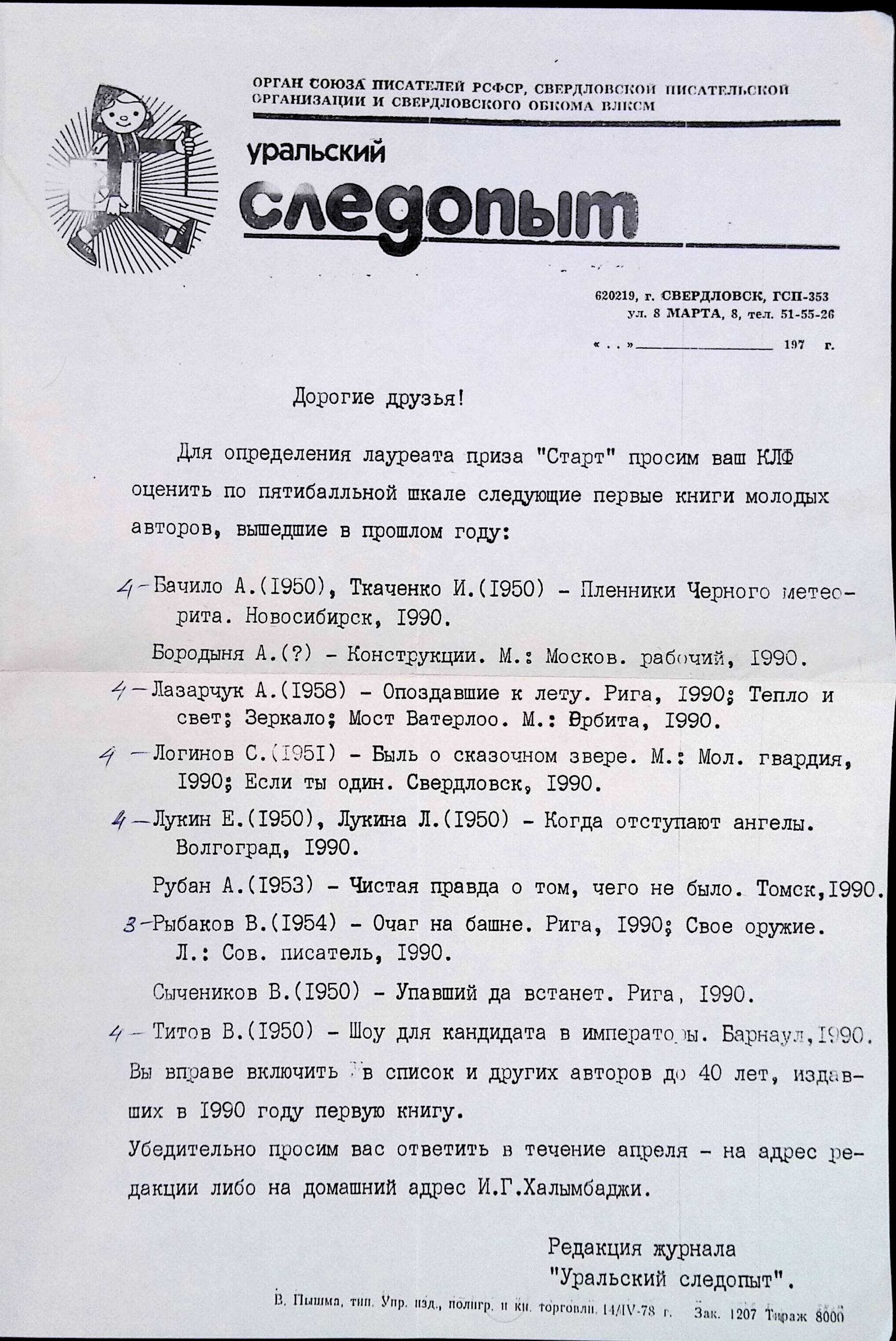 Из конверта, подписанного "УС и Аэлита" (из архива Г. Кузнецова): 1. Анкета УС для голосования по премии "Старт" 2. Реклама подписки УС на 1992 год 3.Тезисы Ю.А. Морозова и Е.В. Карчевского 4. Тезисы Р. Арбитмана, В. Казакова, П. Огуса 5 и 6. Программа "Аэлиты-91" и прочие маргиналии