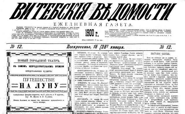Витебские губернские ведомости. 1900. №17. 22 янв. с.3 *** "Осенью 1897 г. Русской комической оперой /почти что космической оперой/ и опереттой (дирекция М.П. Никитиной, главный режисер А.Э. Блюменталь-Тамарин) в московском театре Шелапунтина была осуществлена постановка оперетки-феерии «Необычайное путешествие на Луну» по роману Жюля Верна (переделка М. Ярона, Л. Гулеева). В ГИМе (Москва) сохранилась афиша этого спектакля. 20, 21 и 25 января 1900 г. представление оперетки-феерии состоялось в Витебске в постановке труппы Н.В. Денисова, о чем сообщалось в «Витебских губернских ведомостях». Как известно, в 1902 г. на этот же сюжет был снят первый научно-фантастический фильм в истории кинематографа "Путешествие на Луну / Le voyage dans la lune." Короткометражная фарсовая комедия, пародирующая сюжеты романов Жюля Верна «Из пушки на Луну» и Герберта Уэллса «Первые люди на Луне». Поставлена режиссёром Жоржем Мельесом по собственному сценарию, на созданных им декорациях, на его частной студии и силами его актёрской труппы."