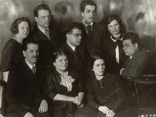 Гинзбурги (1938-1940?). Слева направо. Внизу: Иосиф Файвелевич (дед), Хая (Анна) Лазаревна (бабушка), Сарра Иосифовна (тётя); средний ряд: Роза Юльевна (моя мама, жена Файвеля), Файвель Иосифович (папа), Саул (Шевель) Иосифович (дядя); верхний ряд: Лазарь Иосифович (Лагин – дядя), Давид Иосифович (Додик –дядя), (?) жена дяди Шевеля (?-Анна?)