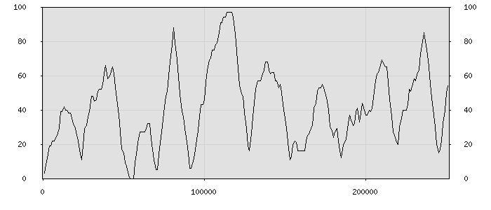 (по горизонтали: счётчик знаков; по вертикали: процент диалогов; размер скользящего окна: знаков, шаг: 1000 знаков) |